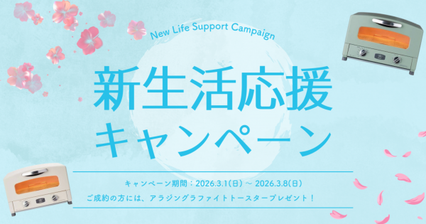 takumi不動産では、期間中にご成約いただいたお客様全員に、新生活で役立つアラジンにグラファイトトースターをプレゼントいたします。